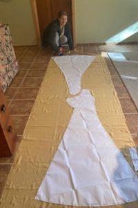 During the first semester, Grace mocked the pattern up to make sure it would fit before she made it. She graded and gridded the pattern, expanding it to life-size from the tiny pattern shown in the museum book, and then altered it to fit her. She took heaps of measurements, figured out all the proportions, and then drew the pattern, using the math she was learning in her grade 11 math course.