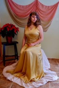 For her capstone project in grade 12, Grace sewed a dress inspired by a Mae West movie costume from the 1930s using an authentic 1939 dress pattern The fabric is gold, fine, and slippery – difficult to work with – but she says, “It was the simplicity and slinkiness of it and the Hollywood vibe that I really liked, and I could see myself wearing it and being comfortable in it. And I learned so much about the 1930s and these kinds of dresses – I was really in my element of learning!”